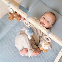 Up with those little arms! Curious babies will have a great time with this wooden baby gym. There are three different activity toys.